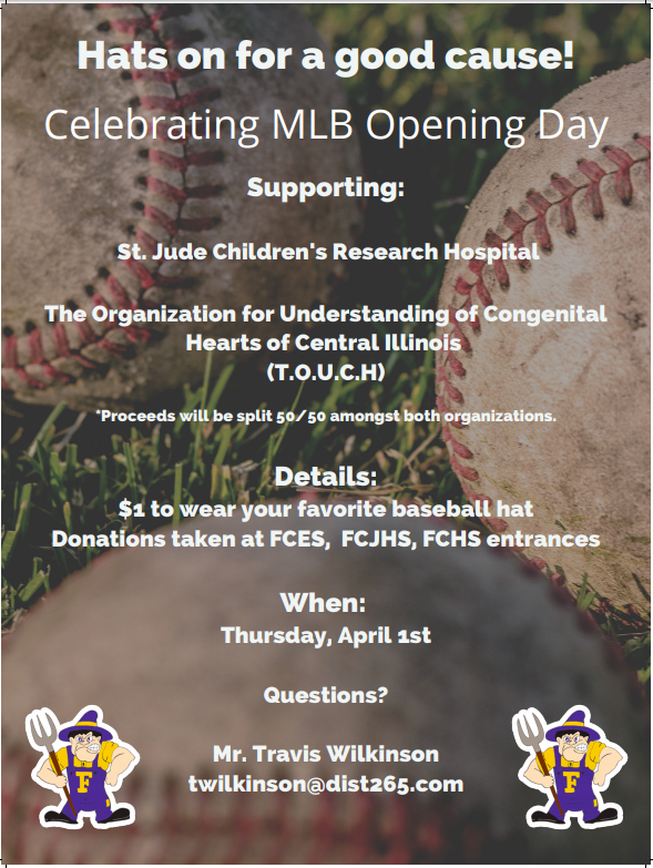 On Thursday, April 1st Farmington Central Schools will be hosting a jersey and hat day to support St. Jude Research Hospital and The Organization for the Understanding of Congenital Hearts (TOUCH) of Central Illinois. Students and staff must pay $1 at the door to participate. Dress code still applies but come on out and wear your favorite baseball gear to support two great causes.