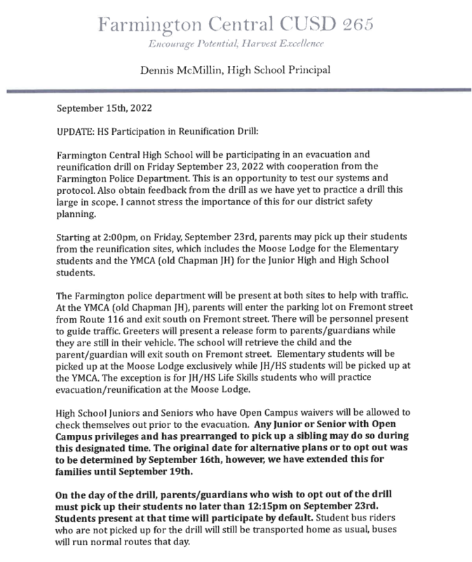 REUNIFICATION DRILL INFORMATION - *UPDATE* FOR 9.23.2022